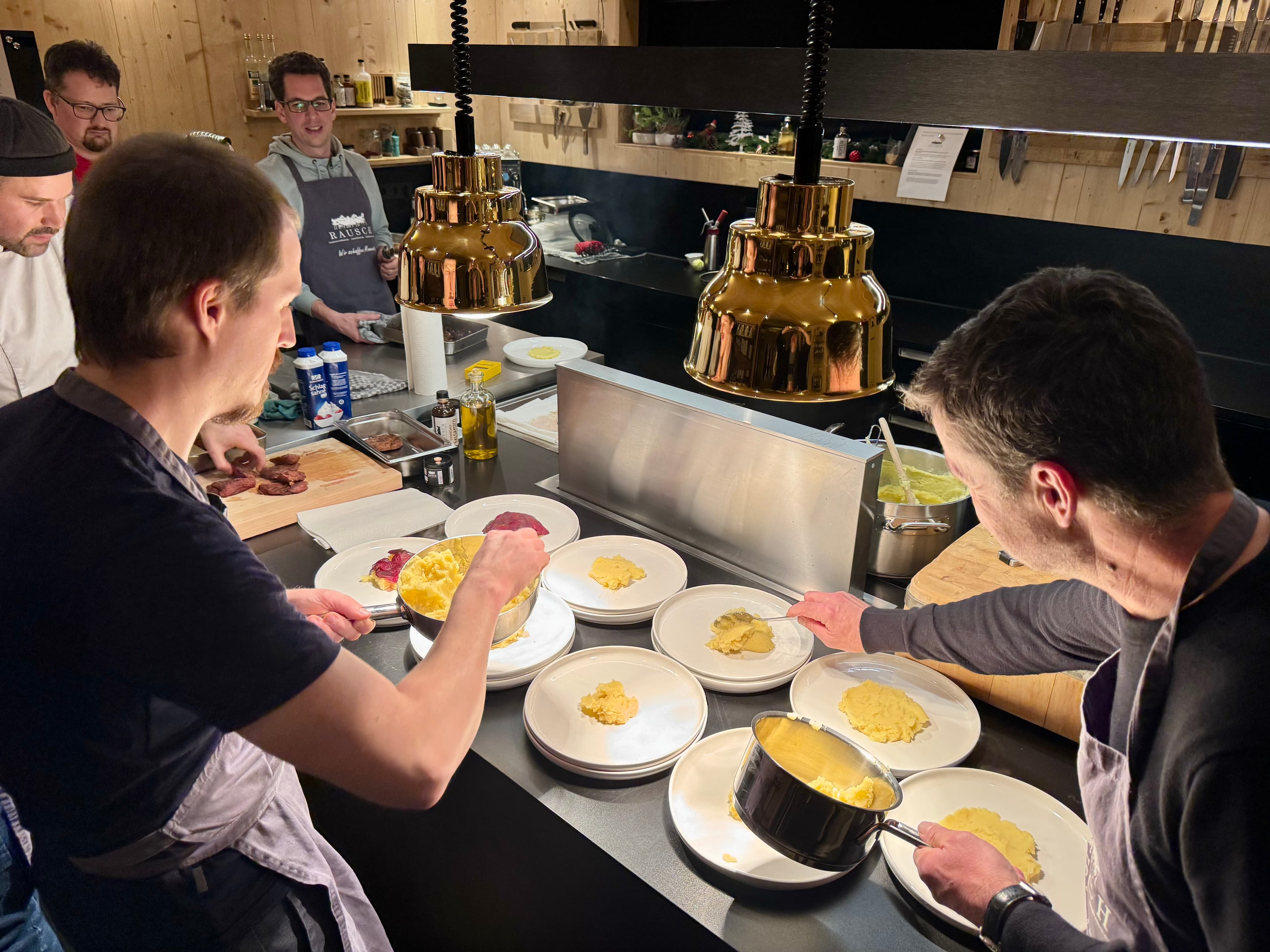 Danach ging es mit Glühwein weiter Richtung Esswerkstatt. Dort haben wir gemeinsam ein köstliches Drei-Gänge-Menü gekocht, geschnippelt, gelacht und am Ende zusammen gegessen. Kein grosses Tamtam, sondern genau die Art von Abend, die daran erinnert, warum Zusammenarbeit mehr ist als Termine und To-dos.